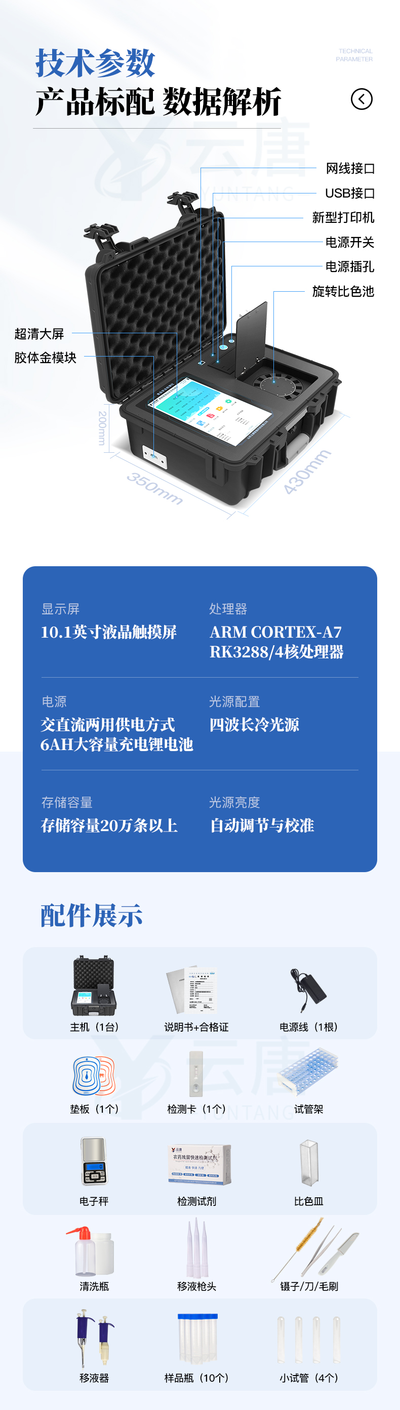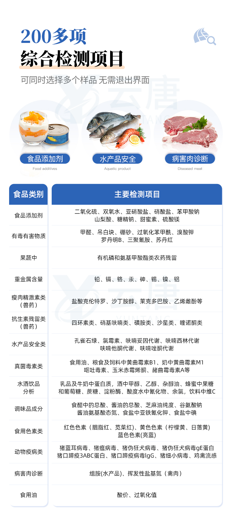 山東云唐智能科技有限公司生產(chǎn)的高智能食品安全檢測(cè)儀可快速檢測(cè)200多種食品安全項(xiàng)目,包含非食用化學(xué)物質(zhì)、濫用食品添加劑、農(nóng)藥殘留、獸藥殘留、重金屬、病害肉、營(yíng)養(yǎng)強(qiáng)化劑、抗生素類殘留、激素類殘留、真菌毒素類殘留、化學(xué)類殘留等項(xiàng)目的定性定量檢測(cè)。