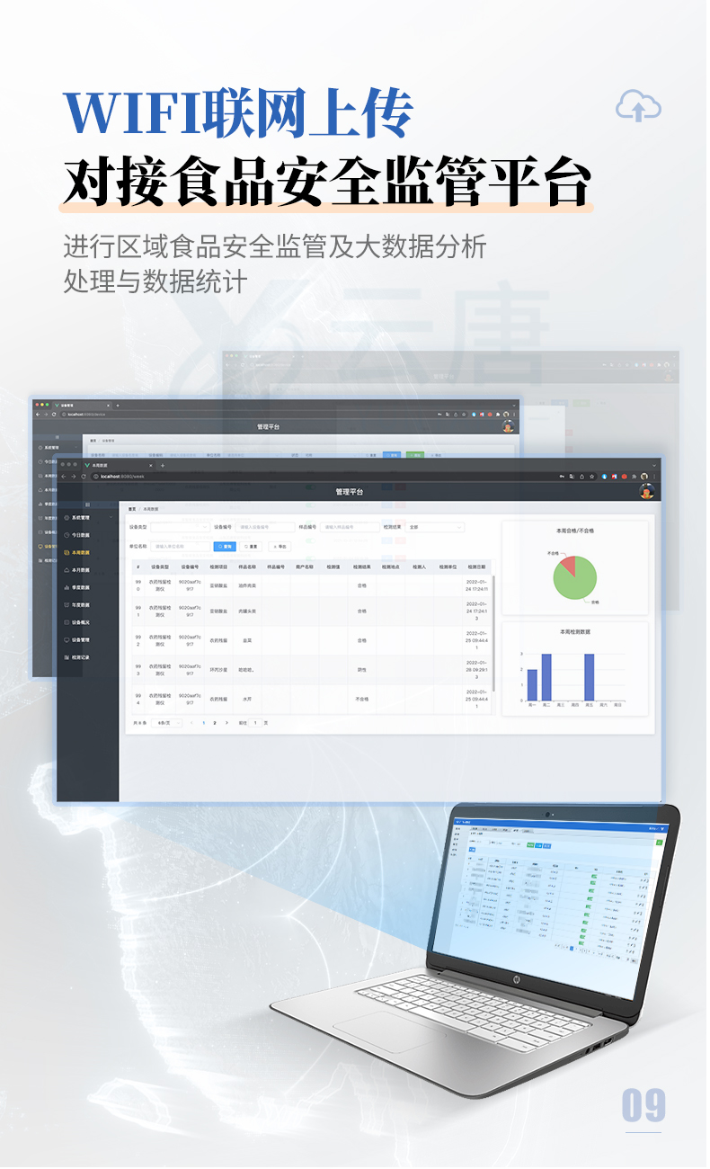 12、儀器具有 wifi 聯(lián)網(wǎng)上傳、RJ45網(wǎng)線連接功能,可以快速上傳數(shù)據(jù)。同步對(duì)接監(jiān)管平臺(tái),數(shù)據(jù)可局域網(wǎng)和互聯(lián)網(wǎng)數(shù)據(jù)上傳,檢測(cè)結(jié)果直接傳至食品安全監(jiān)管平臺(tái)。進(jìn)行區(qū)域食品安全監(jiān)管及大數(shù)據(jù)分析處理與數(shù)據(jù)統(tǒng)計(jì),檢測(cè)區(qū)域食品安全長(zhǎng)短期動(dòng)態(tài),達(dá)到食品安全問(wèn)題預(yù)估、預(yù)警。